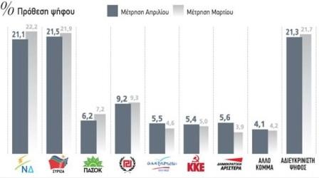 Με 0,4% προηγείται έναντι της ΝΔ στην πρόθεση ψήφου ο ΣΥΡΙΖΑ, σύμφωνα με δημοσκόπηση της εταιρείας «Μetrisi» για την εφημερίδα «Παραπολιτικά». Πιο συγκεκριμένα ο ΣΥΡΙΖΑ συγκεντρώνει ποσοστό 21,5%, με τη ΝΔ να ακολουθεί με 21,1%. Τρίτο κόμμα είναι με 9,2% η Χρυσή Αυγή, ακολουθεί το ΠΑΣΟΚ με 6,2%, 5,6% η ΔΗΜΑΡ, 5,5% οι Ανεξάρτητοι Έλληνες και 5,4% το ΚΚΕ.