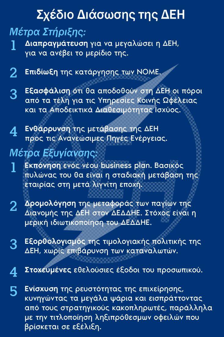 Από πλευράς μου, διαβεβαιώνω προς πάσα κατεύθυνση πως ήρθα εδώ για να συμβάλω στη σωτηρία της ΔΕΗ προς όφελος των καταναλωτών, των εργαζομένων της επιχείρησης και της εθνικής οικονομίας. Σε αντίθεση με τη «μισή ΔΕΗ» του κ. Τσίπρα, θα παλέψουμε για μια μεγαλύτερη και ισχυρή ΔΕΗ.