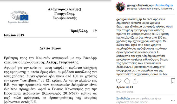 Ερώτηση για το FaceApp κατέθεσε ο Αλέξης Γεωργούλης στην Ευρωπαϊκή Επιτροπή, τη δημοφιλή εφαρμογή στα social media.