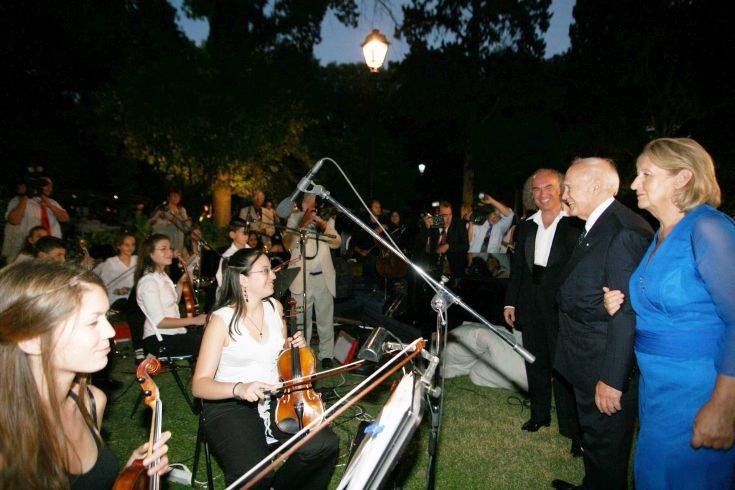 Ο Κωνσταντίνος Καραμανλής έχει εκλεγεί μόλις πριν από δύο μήνες Πρόεδρος της Ελληνικής Δημοκρατίας και ως ένοικος πλέον του Μεγάρου, καταργεί το μέχρι εκείνη τη στιγμή πρωτόκολλο, καλώντας στη δεξίωση αρκετούς εκπροσώπους των γραμμάτων και των τεχνών. Άλλωστε, όπως συνήθιζε να λέει, «το πρωτόκολλο είμαι εγώ». Στους κήπους της Ηρώδου Αττικού 19 θα βρεθούν μεταξύ άλλων ο Οδυσσέας Ελύτης, ο Δημήτρης Χορν, ο Μάνος Χατζιδάκις και αρκετοί ακόμη φίλοι και γνωστοί του ανώτατου πολιτειακού άρχοντα που έδειχνε να το απολαμβάνει φορώντας ένα ολόλευκο κοστούμι.