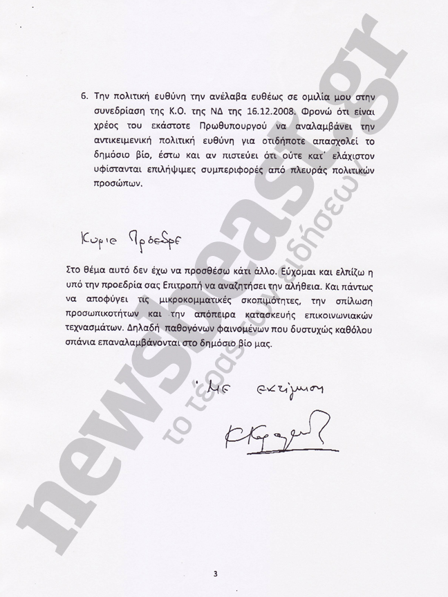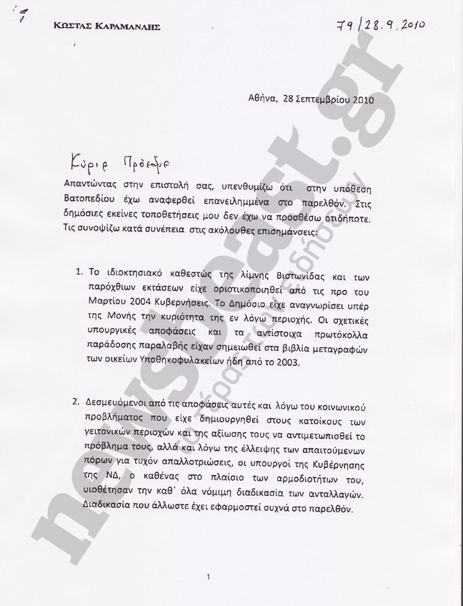 Όπως είχε γράψει το newsbeast.gr ο πρώην πρωθυπουργός στο υπόμνημα που κατέθεσε υποστηρίζει ότι το Βατοπέδι δεν είναι σκάνδαλο, ενώ παράλληλα καλύπτει τους υπουργούς του και τονίζει ότι λειτούργησαν στα πλαίσια της νομιμότητας.