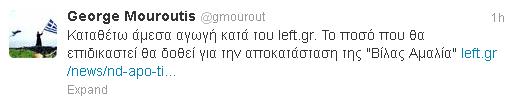 Σε αγωγή κατά της ιστοσελίδας left.gr προχώρησε ο διευθυντής του Γραφείου Τύπου του πρωθυπουργού, Γιώργος Μουρούτης, όπως ανακοίνωσε με μήνυμά του μέσω του twitter, παραπέμποντας σε θέμα του site, υπό τον τίτλο: ΝΔ: Από τις μονταζιέρες στα προϊόντα υποκλοπής.