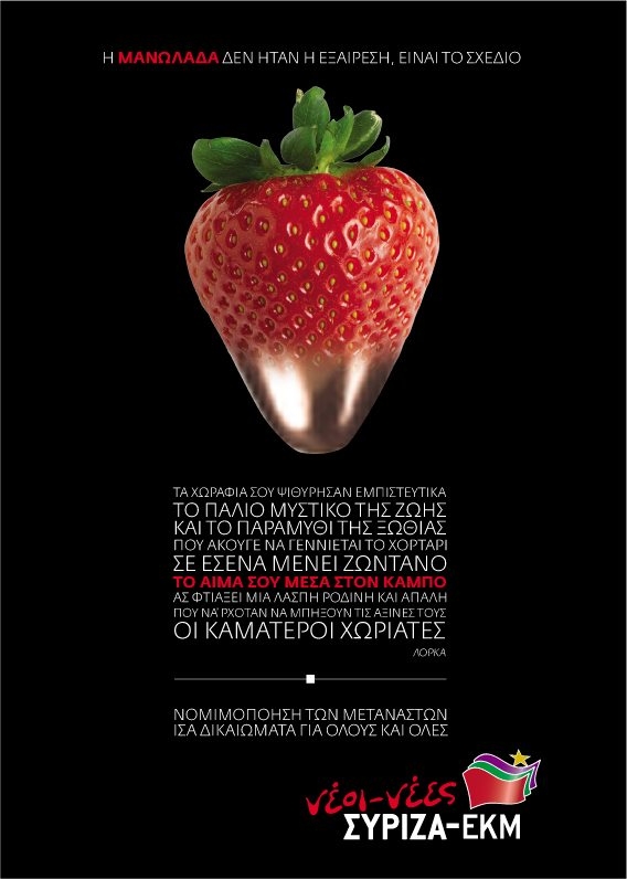 «Είναι τουλάχιστον προκλητική η -ανορθόγραφη- αφίσα της νεολαίας του ΣΥΡΙΖΑ. Προκειμένου να προβάλουν την απαράδεκτη θέση τους για τη νομιμοποίηση των παράνομων μεταναστών, δεν διστάζουν να τζογάρουν πολιτικά με τον ανθρώπινο πόνο, εκμεταλλευόμενοι ακόμα και το απεχθές περιστατικό της Μανωλάδας.