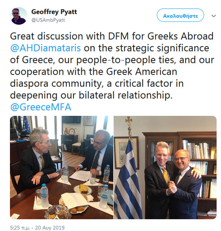 Μάλιστα, σε ανάρτησή του στον προσωπικό του λογαριασμό στο Twitter, ο Τζέφρι Πάιατ χαρακτήρισε τη συνάντηση εξαιρετική και, αναφερόμενος στην ελληνοαμερικάνικη κοινότητα, έκανε λόγο για κρίσιμο παράγοντα στην εμβάθυνση της διμερούς σχέσης Ελλάδας-ΗΠΑ.