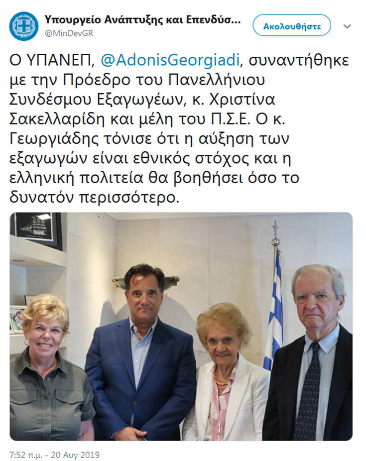 Ο κ. Γεωργιάδης, όπως αναφέρει σε ανάρτησή του στο Twitter, τόνισε ότι η αύξηση των εξαγωγών είναι εθνικός στόχος και η ελληνική πολιτεία θα βοηθήσει όσο το δυνατόν περισσότερο.