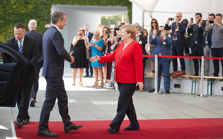 Ο Κυριάκος Μητσοτάκης έτυχε ιδιαίτερα θερμής υποδοχής στην καγκελαρία. Μετά την παρουσίαση των δύο αντιπροσωπειών, αποδόθηκαν οι καθιερωμένες στρατιωτικές τιμές.