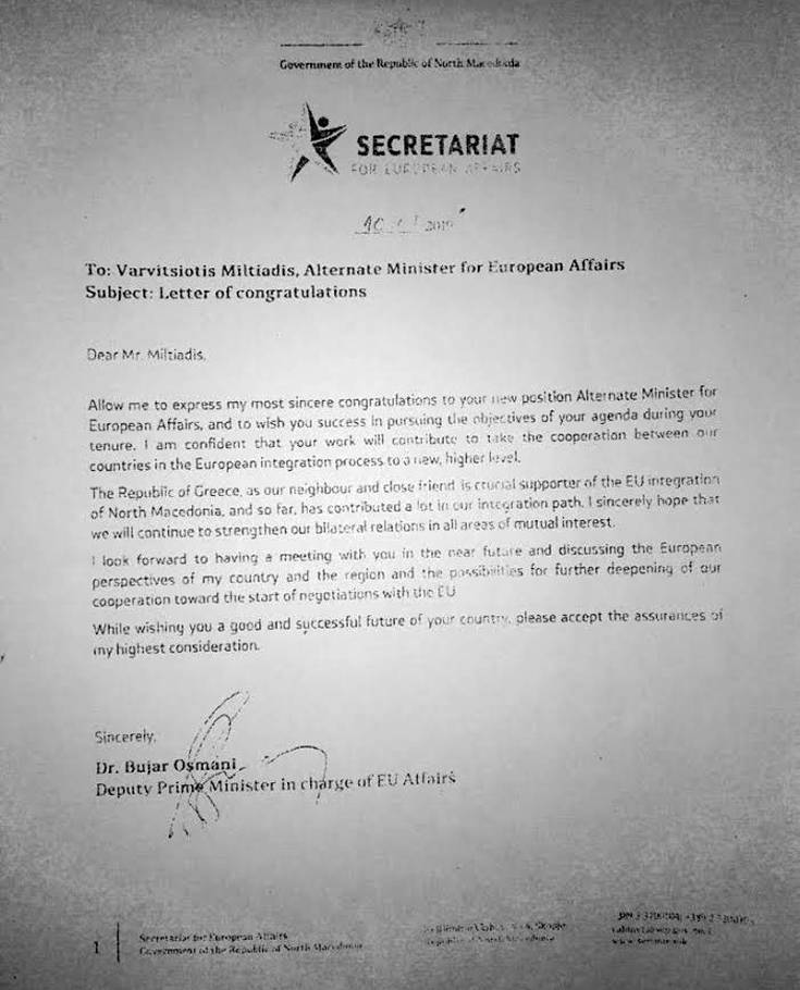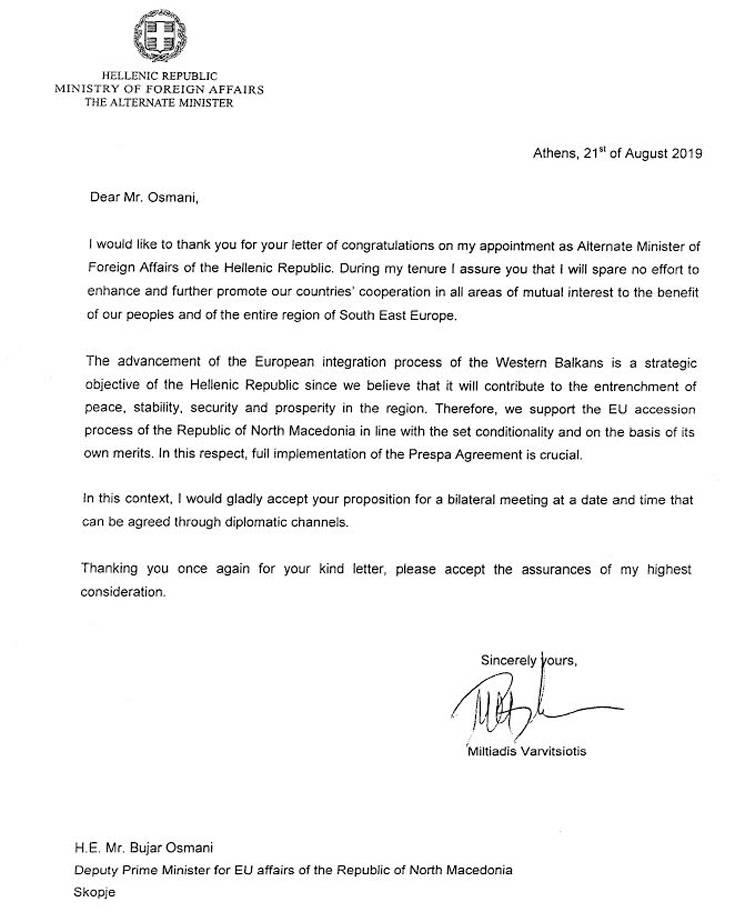 Τις επιστολές που αντάλλαξε με τον αντιπρόεδρο της κυβέρνησης Ζάεφ Μπουγιάρ Οσμάνι παραθέτει στον προσωπικό του λογαριασμό στο Twitter ο αναπληρωτής υπουργός Εξωτερικών Μιλιτιάδης Βαρβιτσιώτης. «Γι’ αυτούς που φαντάζονται κινήσεις μυστικής διπλωματίας, παραθέτω τις επιστολές» σημειώνει χαρακτηριστικά ο κ. Βαρβιτσιώτης και τονίζει: «Η θέση μας για τη Συμφωνία των Πρεσπών παραμένει πως είναι μια συμφωνία με ελαττώματα που υπέγραψε η προηγούμενη κυβέρνηση και δεσμεύει τη χώρα μας».
