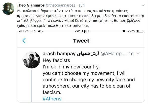 Μέσω Twitter επέλεξε να απαντήσει το μέλος του τομέα Υγείας της Νέας Δημοκρατίας, Θεόδωρος Γιάνναρος, μετά τη διαγραφή του από το κυβερνών κόμμα, εξαιτίας της εξύβρισης του Ιρανού πρόσφυγα Arash Hampay στα social media.