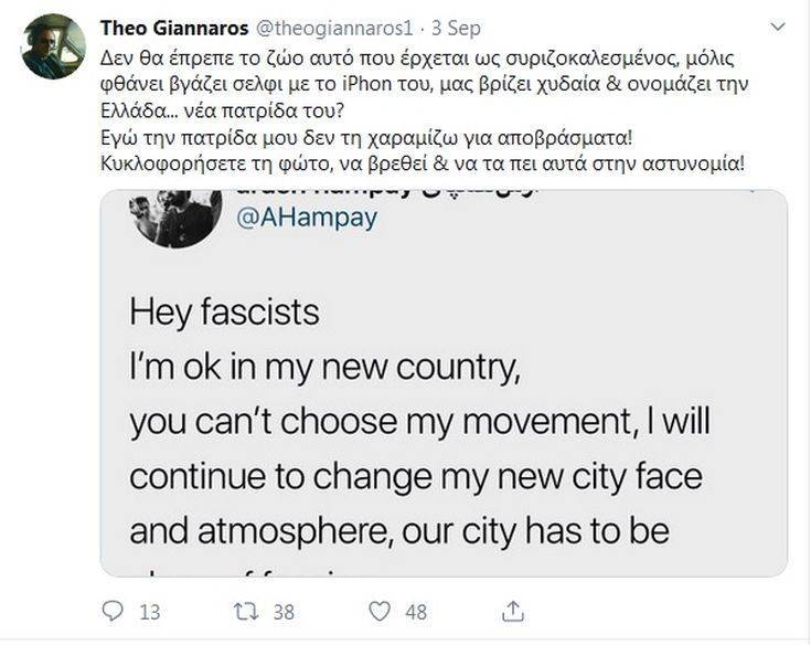 Δεν είχα σκοπό να προσβάλω κανένα “προσφυγα”… Αντέδρασα λάθος σε υβριστικό σχόλιο!— Theo Giannaros (@theogiannaros1) 4 Σεπτεμβρίου 2019