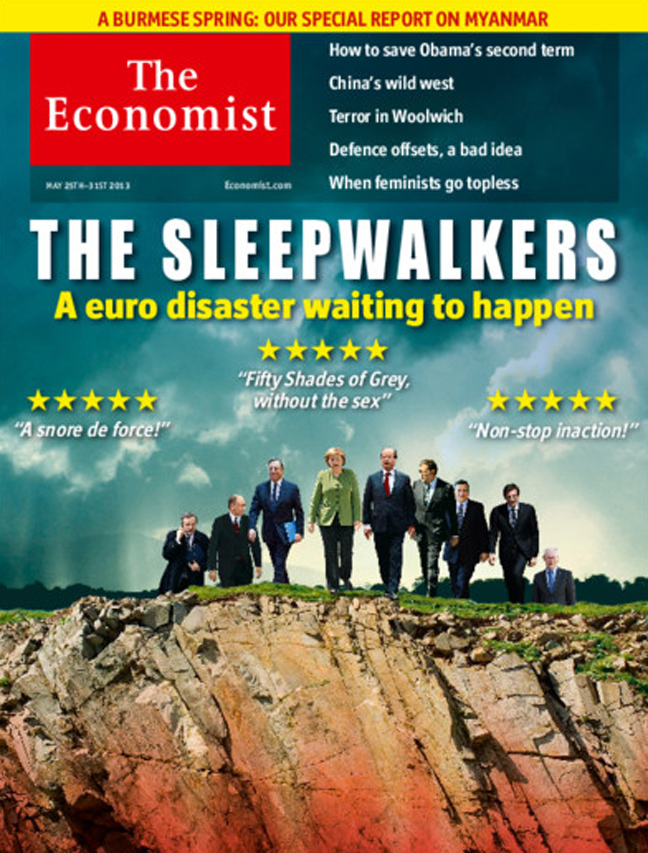«The Sleepwalkers (Οι υπνοβάτες): Μια ευρω-καταστροφή έτοιμη να συμβεί». Με μπόλικη ειρωνεία και σαρκασμό το βρετανικό περιοδικό στο βασικό του άρθρο παρουσιάζει τους ηγέτες της ΕΕ ως υπνοβάτες που βαδίζουν με μαθηματική ακρίβεια προς τον γκρεμό και τους καταλογίζει έλλειψη πολιτικής βούλησης.