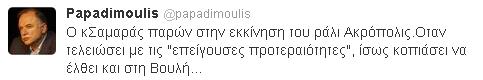 «Ο κ. Σαμαράς παρών στην εκκίνηση του ράλι Ακρόπολις. Όταν τελειώσει με τις “επείγουσες προτεραιότητες”, ίσως κοπιάσει να έλθει και στη Βουλή…», έγραψε στο λογαριασμό του στο twitter ο κ. Παπαδημούλης.