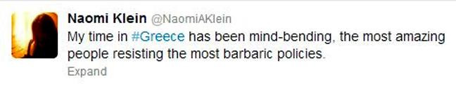 «Ο χρόνος που έμεινα στην Ελλάδα διεύρυνε το μυαλό μου. Οι πιο εκπληκτικοί άνθρωποι αντιστέκονται στις πιο βάρβαρες πολιτικές» γράφει η Καναδή δημοσιογράφος και συγγραφέας, Ναόμι Κλάιν, στο προφίλ της στο twitter, κάνοντας έναν μικρό απολογισμό για την επίσκεψη της στην Ελλάδα.