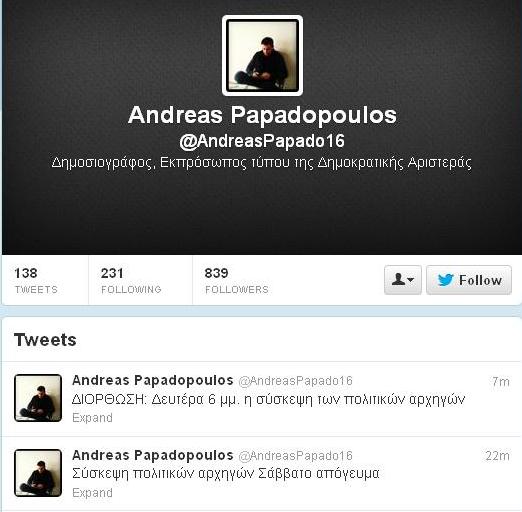 Σύσκεψη των τριών πολιτικών αρχηγών θα γίνει το απόγευμα της Δευτέρας στις 6 όπως ανακοίνωσε με μήνυμά του στο twitter ο εκπρόσωπος Τύπου της Δημοκρατικής Αριστεράς, Αντρέας Παπαδόπουλος.