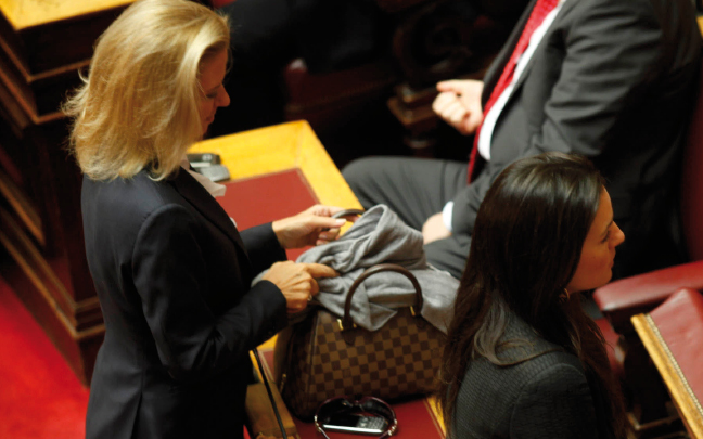 Θα μπορούσε να έχει στην κατοχή της κάτι πολύ πιο ακριβό, γιατί ως γνωστόν είναι σύζυγος εργοστασιάρχη όπως έχει δηλώσει. Αλλά κάνοντας μια τεράστια προσωπική θυσία για χάρη όλων μας, αρκείται σε μια ταπεινή Louis Vuitton. Από την οποία ανασύρει μια απλή ταπεινή καραμέλα για τον λαιμό, την οποία καταναλώνει με δυσανάλογο (και ελαφρώς φοβιστικό) ενθουσιασμό (φωτογραφία κάτω). Προφανώς γιατί όπως ξέρουμε είναι σύζυγος εργοστασιάρχη και θα μπορούσε να έχει αγοράσει ολόκληρο «Ωρυλά», αλλά μας κάνει τη χάρη και αρκείται σε μια απλή καραμέλα.