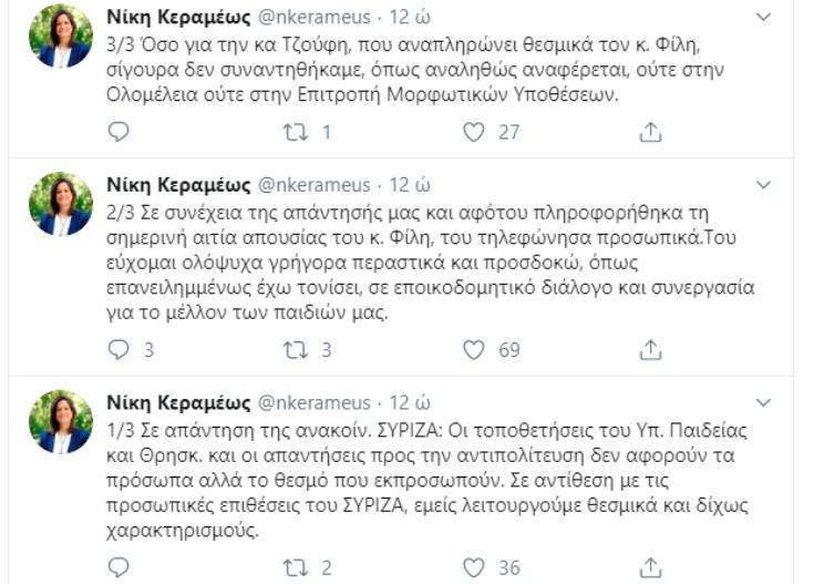 Με ανάρτηση στο Twitter η υπουργός Παιδείας Νίκη Κεραμέως απάντησε στην ανακοίνωση του ΣΥΡΙΖΑ, σχετικά με τη χθεσινή απουσία του Νίκου Φίλη από τη Βουλή.