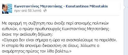 Σε ανάρτηση του στο Facebook ο κ. Μητσοτάκης αναφέρει χαρακτηριστικά: «Δεν είναι ώρα να ανασκαλεύομε το παρελθόν. Η ιστορία θα αποδώσει δικαιοσύνη σε όλους. Ο αναμάρτητος πρώτος το λίθο βαλέτω».