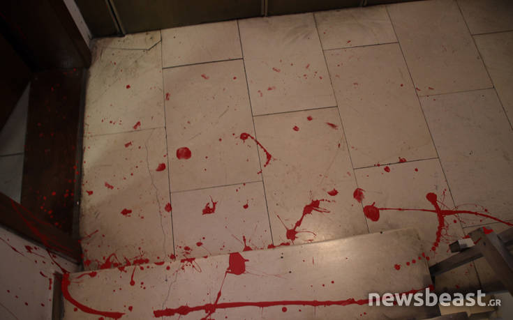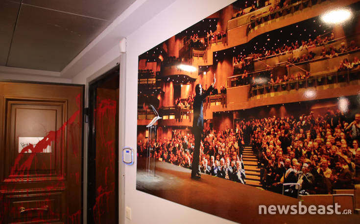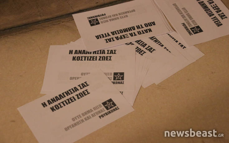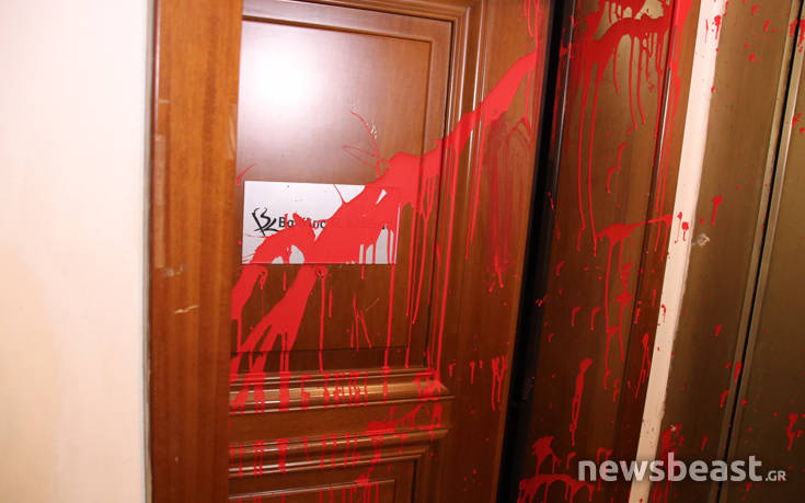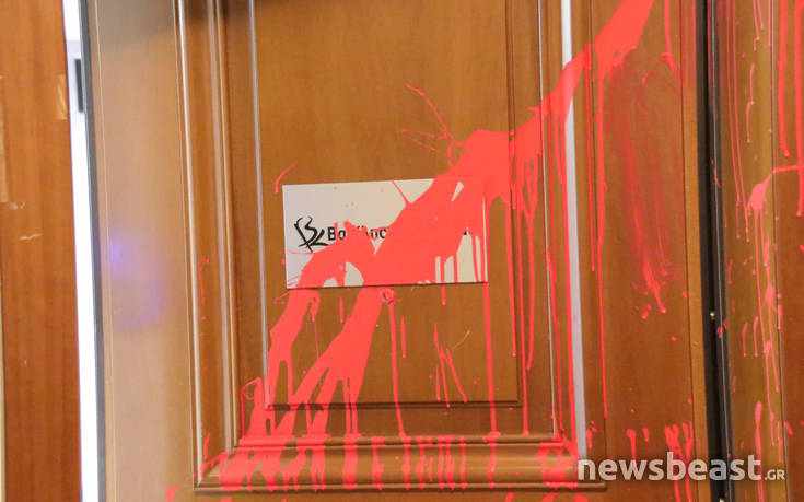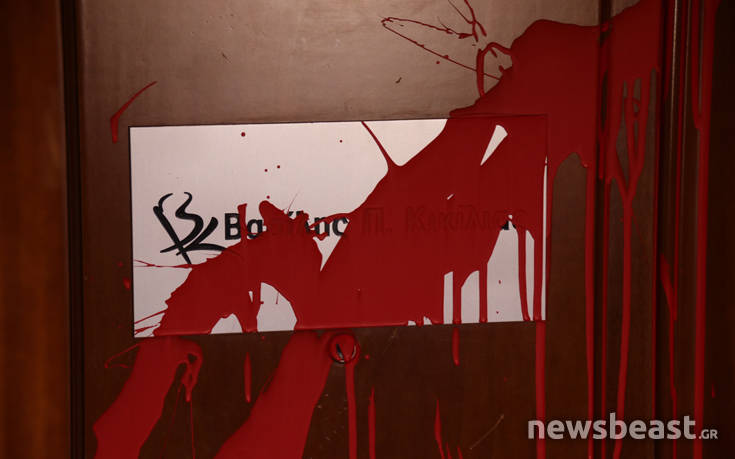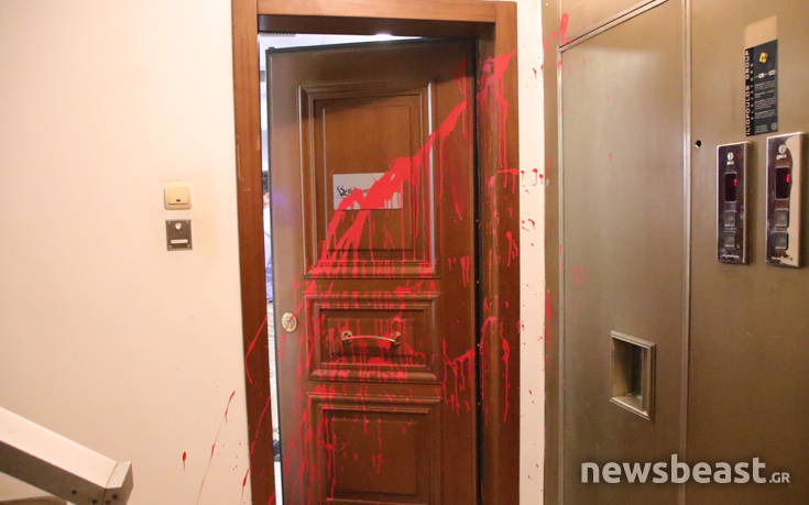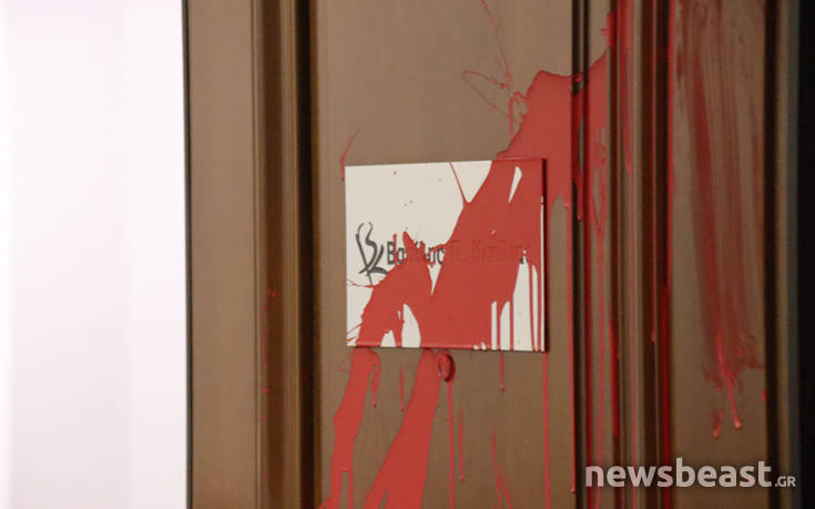Τα μέλη του «Ρουβίκωνα» έριξαν τρικάκια και μπογιές στην πόρτα του πολιτικού γραφείου του υπουργού Υγείας και φώναξαν συνθήματα.