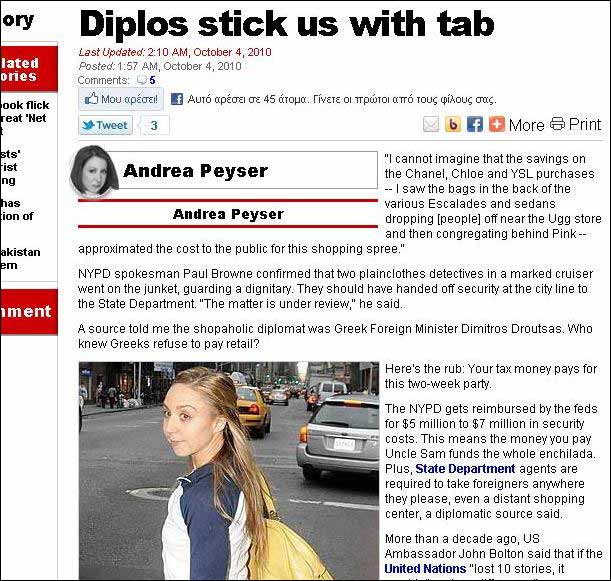 Σύμφωνα με το δημοσίευμα του New York Post , ο έλληνας ΥΠΕΞ δέχεται επίθεση γιατί επιβάρυνε τους αμερικάνους φορολογούμενους προκειμένου να πάει με αυτοκίνητα – που πλήρωσε το κράτος των ΗΠΑ – και να γεμίσει τα πορτ-παγκάζ με αγορές που έκανε από τους οίκους Chanel, Yves Saint Laurent και Chloe.