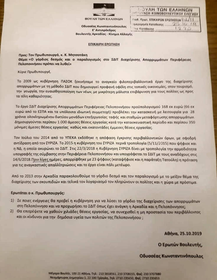 Ο τίτλος της ερώτησης είναι: «Ο γόρδιος δεσμός και ο παραλογισμός στο ΣΔΙΤ (σ.σ. Συμπράξεις Δημοσίου και Ιδιωτικού Τομέα) διαχείρισης απορριμμάτων Περιφέρειας Πελοποννήσου πρέπει να λυθεί».