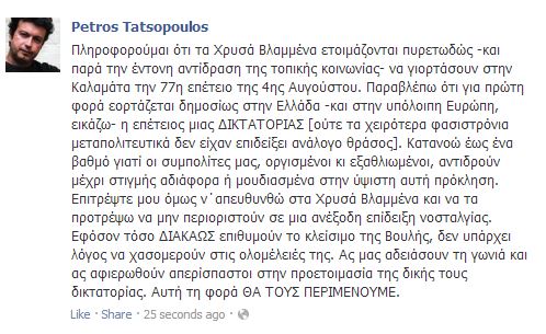 Με αφορμή τις προετοιμασίες της Χ.Α για το εορταστικό φεστιβάλ στις αρχές Αυγούστου στην Καλαμάτα και τα 77 χρόνια από την δικτατορία Μεταξά, ο βουλευτής του ΣΥΡΙΖΑ, Πέτρος Τατσόπουλος, απευθυνόμενος στη Χρυσή Αυγή, τους χαρακτηρίζει «Χρυσά Βλαμμένα» και τους προτρέπει να προετοιμάσουν τη δική τους δικτατορία, τονίζοντας ωστόσο, ότι «Αυτή τη φορά, θα τους περιμένουμε».