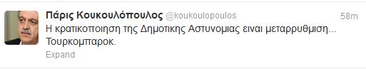 «Η κρατικοποίηση της Δημοτικής Αστυνομίας είναι μεταρρύθμιση… Τουρκομπαρόκ» δήλωσε σκωπτικά ο κ. Κουκουλόπουλος μέσω του λογαριασμού του στο Twitter.