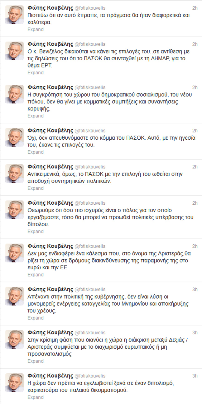 Με έναν τρόπο που δεν μας έχει συνηθίσει, ο πρόεδρος της ΔΗΜΑΡ, Φώτης Κουβέλης μιλά μέσω twitter για την κυβέρνηση, για τον Ευάγγελο Βενιζέλο αλλά και για τον ΣΥΡΙΖΑ. Ο κ. Κουβέλης είναι ιδιαίτερα αιχμηρός κατά του κ. Βενιζέλου και κατηγορεί την κυβέρνηση για μη διαπραγμάτευση και για εκβιασμό του πολιτικού προσωπικού της χώρας.