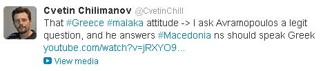 «Αν είσαι από τη Μακεδονία γιατί δεν μιλάς ελληνικά;», απάντησε ο Έλληνας υπουργός Άμυνας, Δημήτρης Αβραμόπουλος, σε Σκοπιανό δημοσιογράφο που τον ρώτησε το θέμα της ονομασίας των Σκοπίων. «Έλληνα Μα…κα» τον χαρακτήρισε ο δημοσιογράφος στο λογαριασμό του στο twitter.