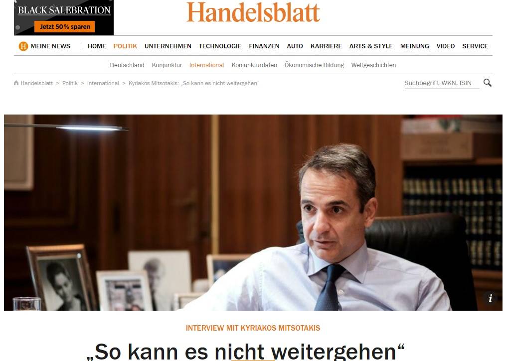 Ο Κυριάκος Μητσοτάκης, με συνέντευξή του στην Handelsblatt, μίλησε για την εικόνα της Ελλάδας, η οποία σύμφωνα με τον πρωθυπουργό έχει αλλάξει και όπως χαρακτηριστικά είπε: «θα είναι μια άλλη χώρα σε δύο χρόνια από σήμερα»