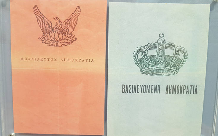 11. Ψηφοδέλτια του δημοψηφίσματος της 3ης Νοεμβρίου 1935 για το πολιτειακό. Το δημοψήφισμα διενεργήθηκε από τη δικτατορική κυβέρνηση Κονδύλη με αποτέλεσμα που αποδείκνυε την εκτεταμένη νοθεία: η βασιλεία έλαβε το 97,88% των ψήφων και η δημοκρατία το 2,12%.
