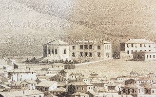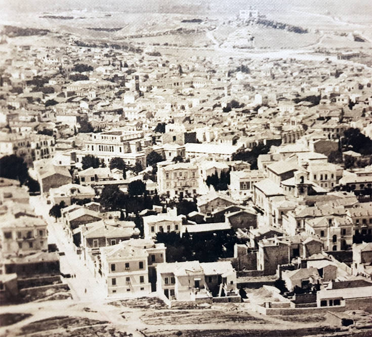 19. Άποψη τμήματος της Αθήνας από τις νότιες υπώρειες του Λυκαβηττού το 1874. Στο κέντρο, το υπό ανέγερση κτίριο του Βουλευτηρίου (η «Παλαιά Βουλή» επί της οδού Σταδίου). Ακριβώς στα δεξιά του, εντός του περιβόλου, διακρίνεται το επίμηκες ξύλινο κτίσμα, η λεγόμενη «Παράγκα» που αρχικά συνεδρίαζαν οι βουλευτές μέχρι να ολοκληρωθεί το γειτονικό κτίριο.