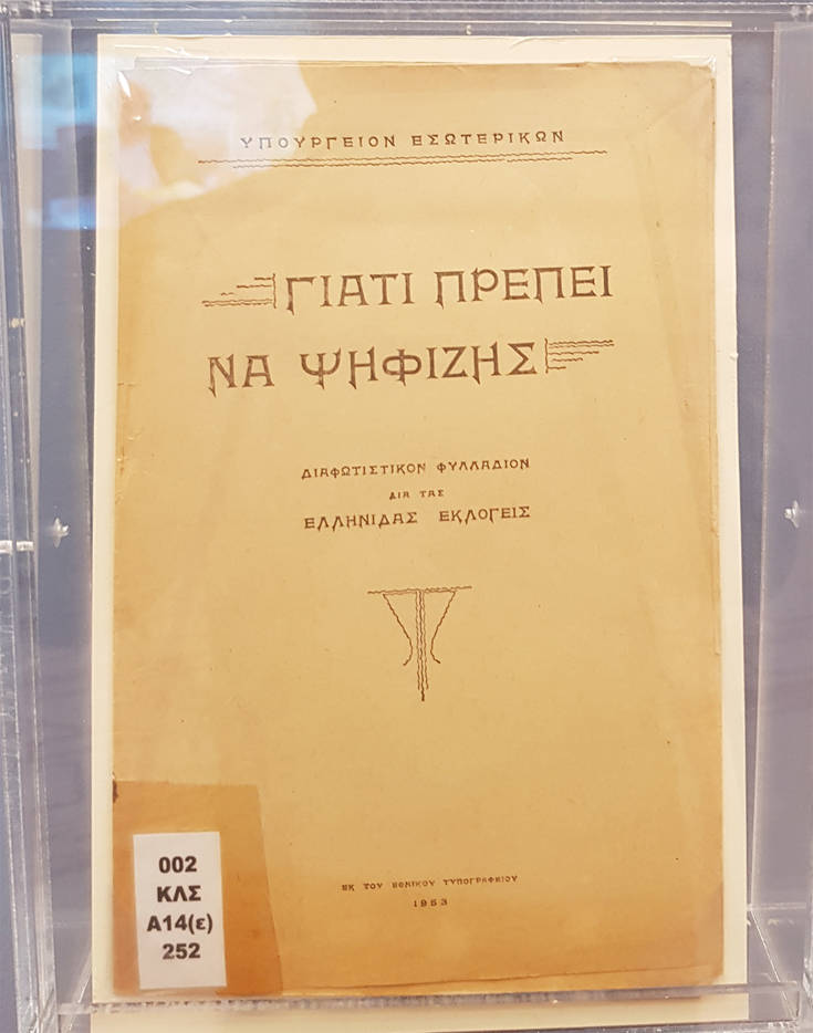 8. Φυλλάδιο του Υπουργείου Εσωτερικών του 1953 που αναφέρεται στους λόγους για τους οποίους θα πρέπει να ψηφίζουν οι γυναίκες. Με το Σύνταγμα του 1952 προβλεπόταν η απόκτηση πολιτικών δικαιωμάτων από τις γυναίκες, που εφαρμόστηκε με τον νόμο 2159 της 2ας Ιουλίου 1952.