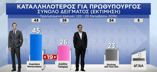 Καταλληλότερος για πρωθυπουργός παραμένει ο Κυριάκος Μητσοτάκης με 45% έναντι 26% του Αλέξη Τσίπρα, στο 23% κυμαίνεται η απάντηση «κανένας από τους δύο».
