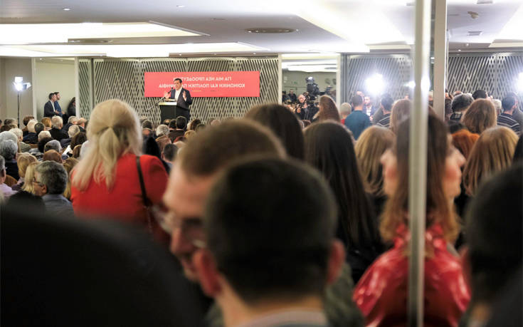 Ο αρχηγός του ΣΥΡΙΖΑ έφθασε στην αίθουσα κεντρικού ξενοδοχείου που ήταν ήδη κατάμεστη, συνοδευόμενος από τον Στέφανο Τζουμάκα και έγινε δεκτός με θερμό χειροκρότημα και με το σύνθημα «Ενώνουμε το μέτωπο να πέσει η δεξιά απ’ τα Πανεπιστήμια μέχρι την δουλειά». Η πλειονότητα των συγκεντρωμένων ήταν πρώην στελέχη του ΠΑΣΟΚ.