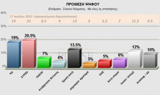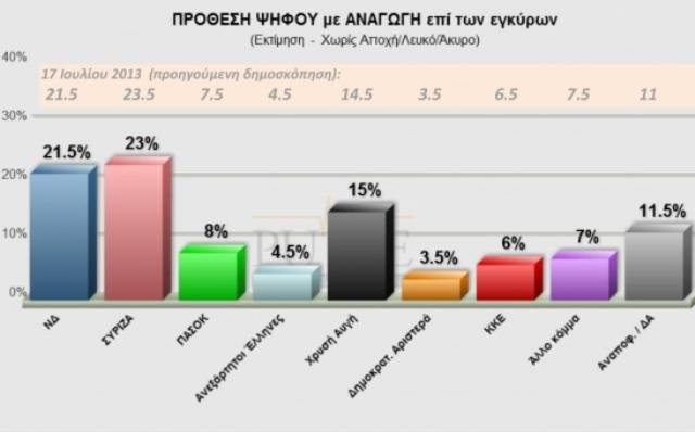 Νέα άνοδο εμφανίζει η Χρυσή Αυγή εμφανίζει νέα άνοδο και φτάνει στο 13,5% (15% με την αναγωγή).