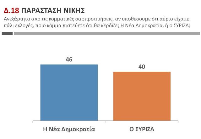 Στην παράσταση νίκης παραμένει μπροστά η ΝΔ με 46% και ακολουθεί ο ΣΥΡΙΖΑ με 40%, ωστόσο τα ποσοστά της ΝΔ είναι μειωμένα από το Βαρόμετρο του Ιουλίου και αντίθετα του ΣΥΡΙΖΑ αυξημένα, καθώς τότε είχαν λάβει 53% και 43% αντίστοιχα.
