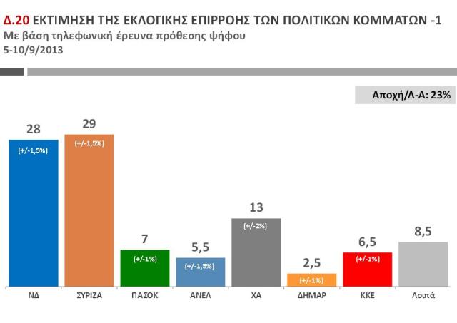 Προβάδισμα μίας μονάδας στο ΣΥΡΙΖΑ στην πρόθεση ψήφου, με ποσοστό 29% και δεύτερη τη Νέα Δημοκρατία με 28% δίνει νέα Δημοσκόπηση της Public Issue για λογαριασμό του ΣΚΑΪ. Στην τρίτη θέση ακολουθεί η Χρυσή Αυγή με 13%.