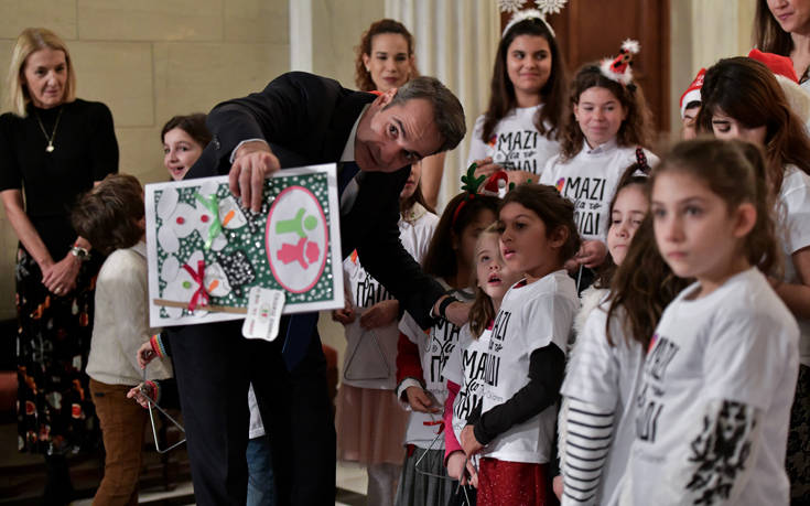 Μετά, ο Κυριάκος Μητσοτάκης άκουσε τα κάλαντα από παιδιά από τον Σύλλογο «Μαζί για το παιδί», που απέσπασαν ζεστά χαμόγελα με τη ζωντάνια, την αστείρευτη χαρά τους και τα τρίγωνά τους. Τα παιδιά δώρισαν στον πρωθυπουργό μία μπλούζα με το σήμα του «Μαζί για το Παιδί» και μία κάρτα με τα ονόματά τους.