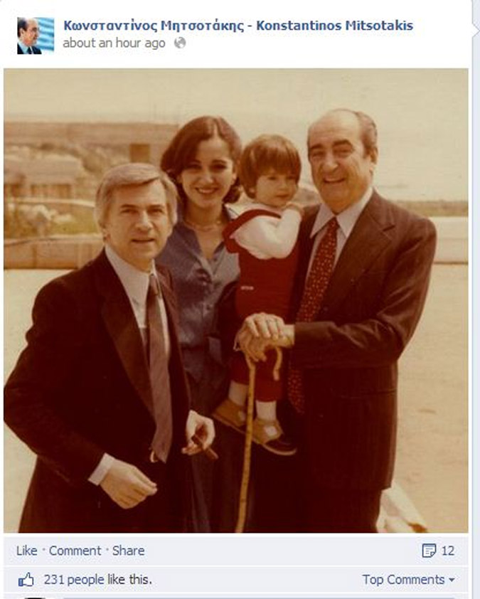 Στη φωτογραφία βλέπουμε τον Παύλο Μπακογιάννη με τον γιο του Κώστα Μπακογιάννη, ο οποίος σήμερα είναι δήμαρχος Καρπενησίου, τον Κωνσταντίνο Μητσοτάκη και την Ντόρα Μπακογιάννη.