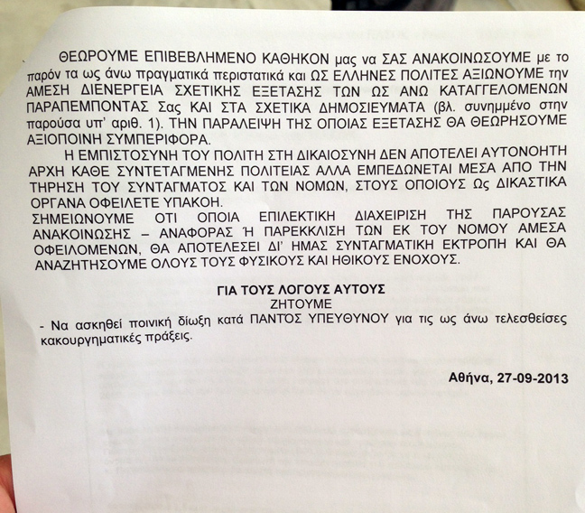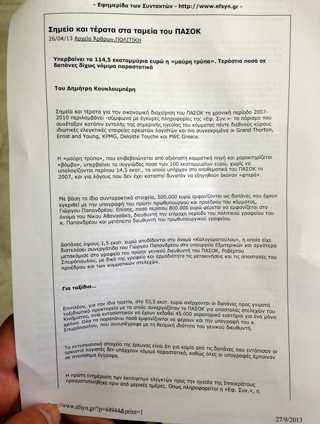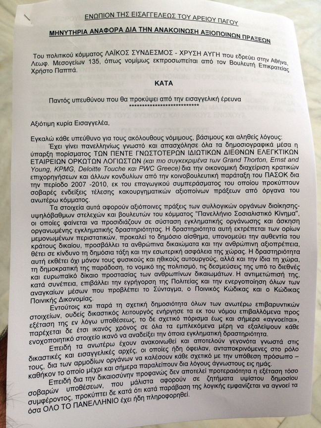 «Τα στοιχεία που καταθέσαμε αφορούν αξιόποινες πράξεις των συλλογικών οργάνων της διοίκησης, υψηλόβαθμων στελεχών και βουλευτών του ΠΑΣΟΚ, που φαίνεται να προσιδιάζουν, τη σύσταση εγκληματικής οργάνωσης, και άσκηση οργανωμένης εγκληματικής δραστηριότητας».
