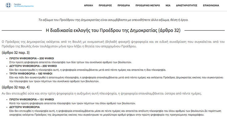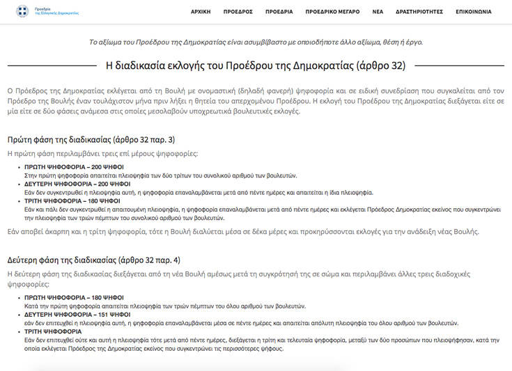 Σε άμεση τροποποίηση των κειμένων της αναγκάστηκε να προβεί η ιστοσελίδα της Προεδρίας της Δημοκρατίας μετά την προ ημερών αποκάλυψη του newsbeast πως όποιος έμπαινε στην επίσημη διεύθυνσή της (presidency.gr), διάβαζε ότι σε περίπτωση που δεν καταφέρει να εκλέξει η Βουλή ανώτατο πολιτειακό άρχοντα τότε η χώρα οδηγείται σε πρόωρες εκλογές, κάτι που βέβαια δεν ισχύει από τον περασμένο Νοέμβριο που αναθεωρήθηκε το Σύνταγμα και ένθεν. Ακόμη και την ημέρα που εκλεγόταν η κ. Κατερίνα Σακελλαροπούλου ως η επόμενη Πρόεδρος της Δημοκρατίας, οι επισκέπτες του επίσημου site της Προεδρίας διάβαζαν λανθασμένες πληροφορίες.