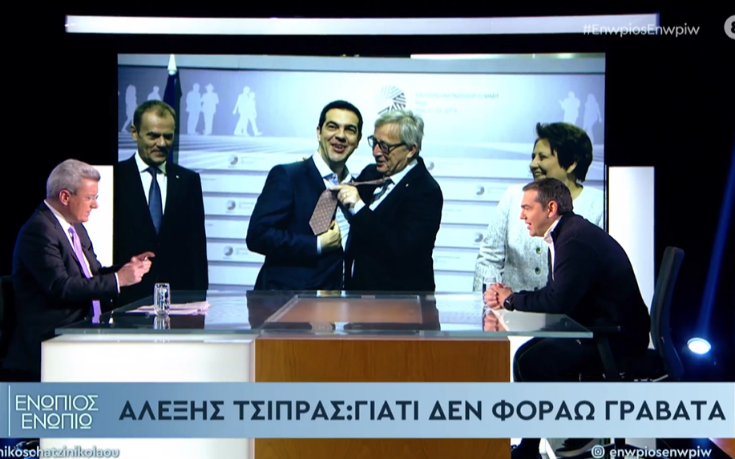 Ο Αλέξης Τσίπρας απάντησε στο γιατί αρνείται να φορέσει γραβάτα. «Θέλησα να υπάρχει ένας συμβολισμός και τελικά εγκλωβίστηκα στην άλλη πλευρά. Όταν έγινα πρωθυπουργός, είχα πει πως θα συνεχίσω να μένω στο νοίκι, πως θα κάνω ότι έκανα πριν, πως δεν θα συμβιβαστώ και πως δεν θα βάλω γραβάτα επειδή ήθελα να δείξω πως δεν θα αλλάξω», τόνισε ο Αλέξης Τσίπρας σε συνέντευξή του στο Νίκο Χατζηνικολάου και την εκπομπή Ενώπιος Ενωπίω και πρόσθεσε: