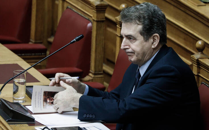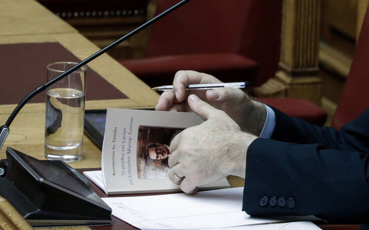 Κατά τη διάρκεια της συζήτησης, ο φωτογραφικός φακός του πρακτορείου Eurokinissi απαθανάτισε τον υπουργό να ξεφυλλίζει ένα βιβλίο, το οποίο φέρει την υπογραφή του Προέδρου της Βουλής Κώστα Τασούλα.