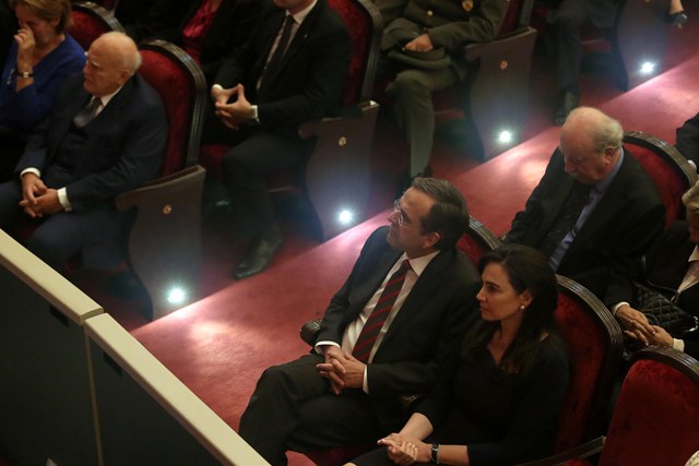 Ο δήμαρχος Πειραιά Βασίλης Μιχαλολιάκος προσέφερε στον Πρόεδρο της Δημοκρατίας και τον πρωθυπουργό πλακέτα με το συλλεκτικό γραμματόσημο που έχουν εκδώσει τα ΕΛΤΑ με αφορμή την επαναλειτουργία του Θεάτρου.