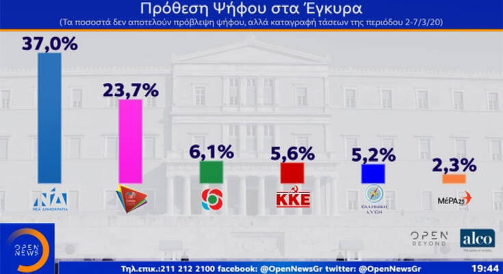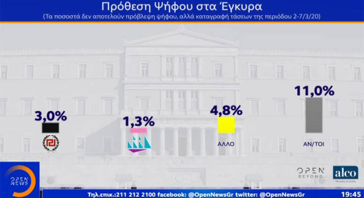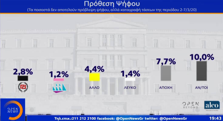 Στην έρευνα που ολοκληρώθηκε στις 7 Μαρτίου συμμετείχε δείγμα 1.000 πολιτών, με όλους τους δείκτες να δείχνουν τη Νέα Δημοκρατία κερδισμένη, σε περίπτωση που διεξάγονταν τώρα εκλογές.