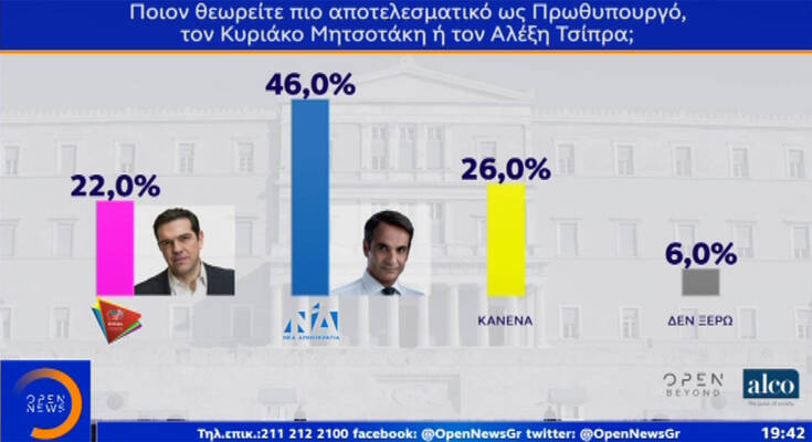 Στο ερώτημα για το ποιος είναι πιο αποτελεσματικός πρωθυπουργός, ο Κυριάκος Μητσοτάκης προηγείται με 46% έναντι 22% του Αλέξη Τσίπρα.