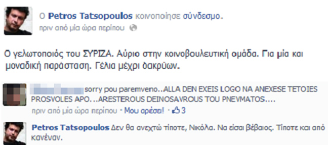 Απάντηση μέσω Facebooκ για την ανακοίνωση Μουλόπουλου, έδωσε ο βουλευτής του ΣΥΡΙΖΑ, Πέτρος Τατσόπουλος.