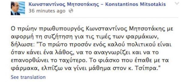 Μέσω της προσωπικής του σελίδας στο Facebook επέλεξε ξανά ο πρώην πρωθυπουργός, Κωνσταντίνος Μητσοτάκης, να παρέμβει στο θέμα της τιμής των φαρμάκων, που έχει γίνει πεδίο σκληρής κόντρας ανάμεσα σε κυβέρνηση και ΣΥΡΙΖΑ.