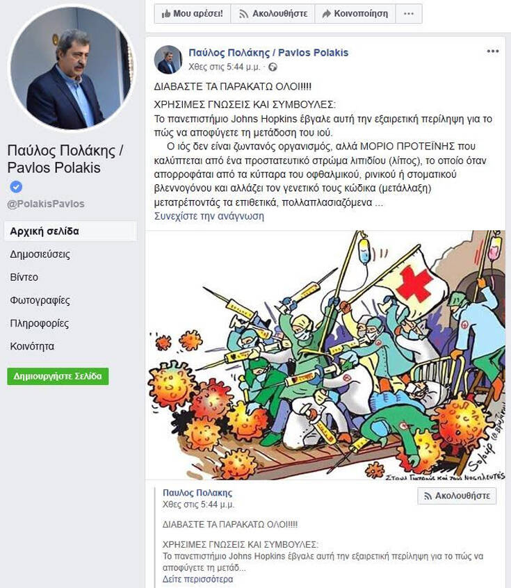Fake news αποδείχθηκαν οι συμβουλές που έδινε ο τέως αναπληρωτής υπουργός Υγείας Παύλος Πολάκης στο Facebook αναφορικά με τον τρόπο που θα πρέπει να προστατευόμαστε από τον κορονοϊό.