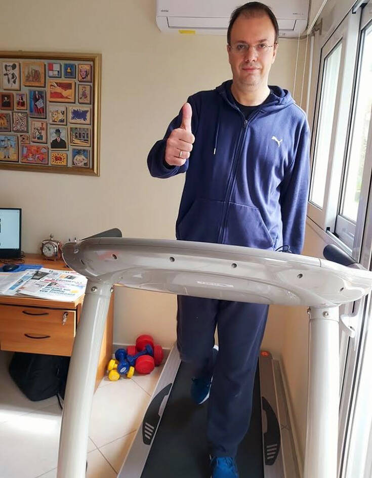 Ο 42χρονος πολιτικός ανέβασε στον προσωπικό του λογαριασμό στο Facebook φωτογραφίες που τον δείχνουν με φόρμα και αθλητικά παπούτσια να κάνει γυμναστική σε κυλιόμενο διάδρομο που έχει στήσει στο λιτό γραφείο της οικίας του.