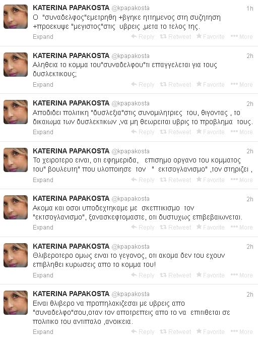 Με μια σειρά από tweets, η Κατερίνα Παπακώστα, η οποία ήταν παρούσα στο επεισόδιο μεταξύ του βουλευτή του ΣΥΡΙΖΑ, Νάσου Αθανασίου και του στελέχους του ΠΑΣΟΚ, Αφροδίτης Αλ Σάλεχ, εξαπολύει επίθεση εναντίον του πρώτου, επισημαίνοντας ότι επιβεβαιώνονται τα περί «εκτσογλανισμού» του ΣΥΡΙΖΑ, όπως είχε επισημάνει πρόσφατα ο πρόεδρος του ΠΑΣΟΚ, Ε. Βενιζέλος.